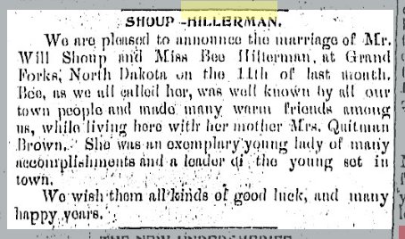 November 1898 "Miss Bee Hillerman of Church's Ferry, North Dakota, is visiting her mother, Mrs. Judge Brown."