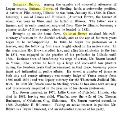 1880 Pike County, Illinois "Quitman Brown is engaged in the practice of law at Milton."