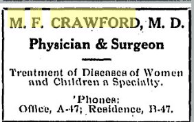 November 1933 "Dr. C. C. Crawford, a former Wray physician and who has more recently been