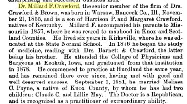 He was born Feb. 13, 1877, at Keokuk. In June, 1907, he married Miss Lillian Mae Crawford,