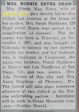 1906 Longmont "Charles Estes and daughter, Ida, of Boulder, visited several days with his brother, E. J. Estes and family."