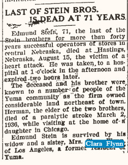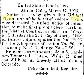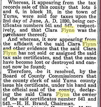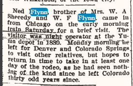 June 1906 "Wm. Flynn, an old time resident of Yuma, was in Yuma last Saturday."
