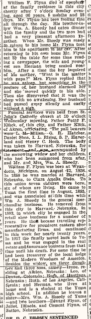 July 1899 "Mr. William Flynn and family of Harvard, Neb., are visiting his sister, Mrs. W. A. Sheedy."