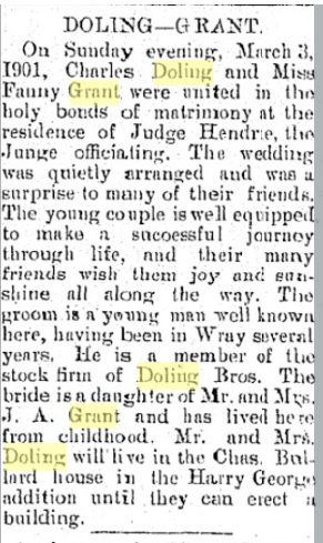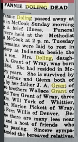 December 1, 1932 "The following relatives motored to McCook Tuesday to attend the funeral of Mrs. Fanny Doling, a former Wray lady who passed away Sunday morning: Mr. and Mrs. T. G. Grant, Mr. and Mrs. Marion Pickett and daughters Isabel and Mrs. Catherine Christiansen, and Mrs. Fern Willis, the latter of Denver."