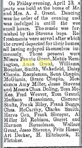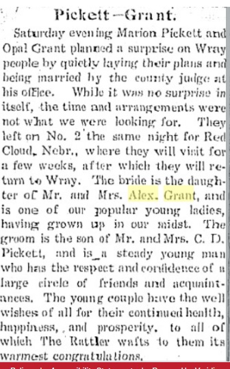 May 1899 Wray " Misses Ella Lynam, Eva Grant, Anna Grant and Fred Weaver and Joe Davis visited with Mr. and Mrs. Alex Grant on the Black Wolf Sunday. "