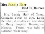 November 1906 "Mrs. Fannie Harr, wife of Matt Harr, was taken to Denver Monday afternoon and placed in St. Lukes hospital, where it is hoped that she may be speedily nursed baok to good health."