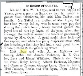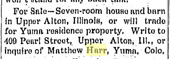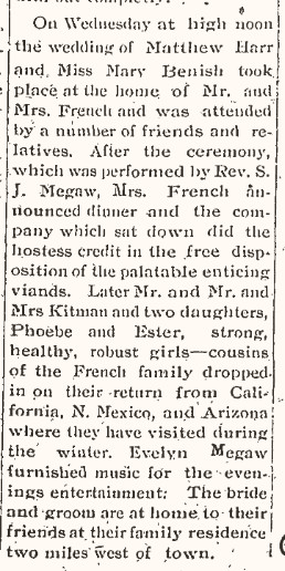 April 1911 Yuma "Mrs. Morris visited a few days with Mr. and Mrs. Matthew Harr. Mrs. Harr and Mrs. Morris drove over to the Benish place to visit relations Sunday."