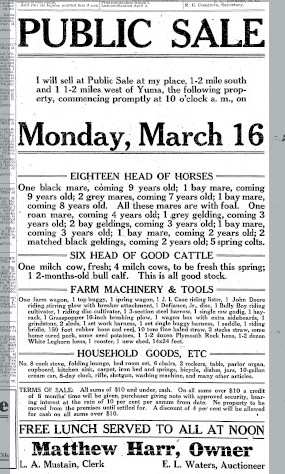 March 1912 " For Sale - Ten fresh milch cow ; one J. I. Case combination sulky plow; one disc; several good work horses, 4 and 5 years old; one mare, 5 years old.