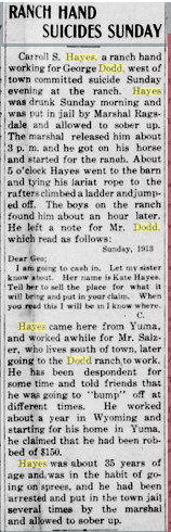 Word was received here Tuesday that Carl Hayes had commmitted suicide, by hanging himself, in a barn on the Geo. A. Dodd ranch, near Brush. Carl left here