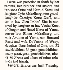 He was predeceased by his siblings, Orlie "Slim" Kerst, Opel Mekelburg and Harold "Stub" Kerst.