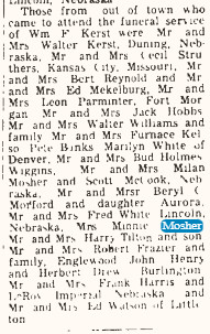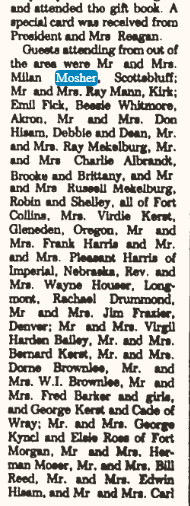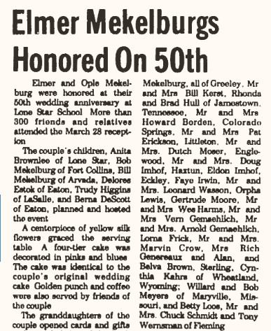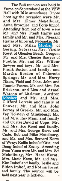 September 1970 "Mr. and Mrs. Art Mekelburg and Mrs. Anna Hisam visited at the Herman Mosher home in Greeley.