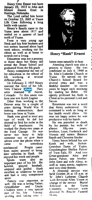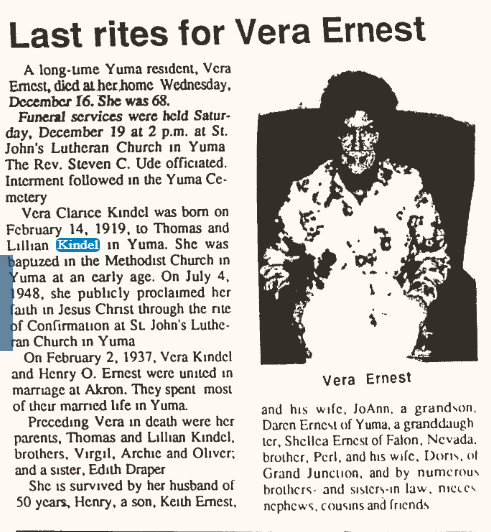 April 7, Yuma "Mrs. Kindel will be remembered here as the mother of Mrs. Henry (Vera) Ernest. Mr. and Mrs. Ernest and Mr. and Mrs. Keith