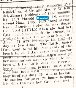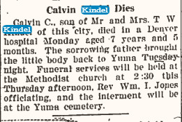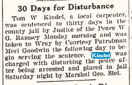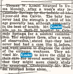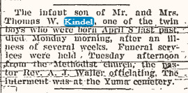 He is survived by three Brothers, Oliver Kindel of Calif., Perl and George Kindel, both of grand Junction. Colo., and a sister, Vera Ernest of Yuma. The body will be cremated. Spalding mortuary is handling arrangements."