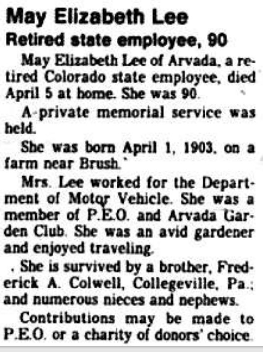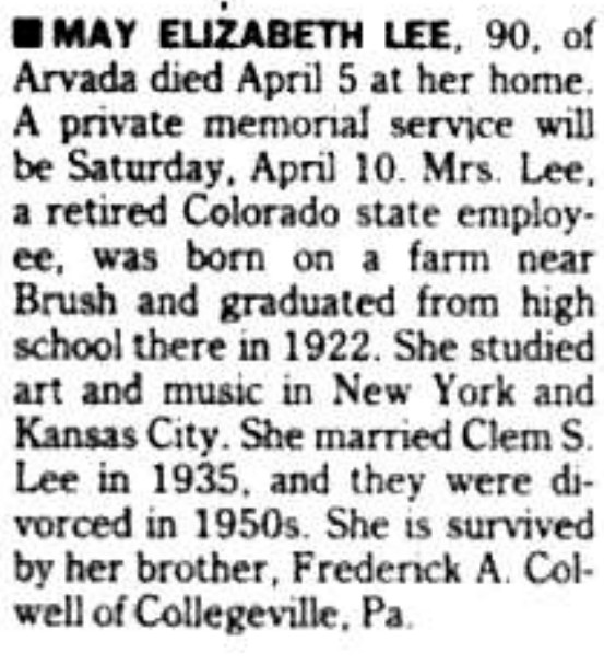 Clem S. Lee and May E. Colwell married 4 Oct 1935 in Brush, Colorado.