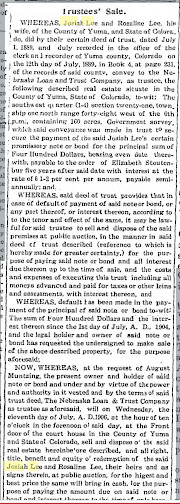Brush, Colorado "DIED - January 5th,1901, at 4 p.m. of paralysis of the heart, Josiah Lee, aged 57 years, 3 months and 23 days.