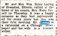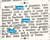 October 1958 "...Mrs. John Bailiff entertained.. a dinner Saturday honoring Mr. and Mrs. Loring, who were visisting from Glendale, California.