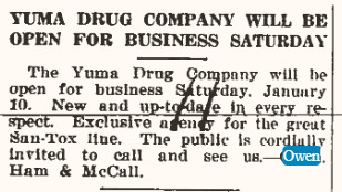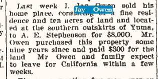 June 1900 " I. J. Owen of Bolivar, Mo., who traded for the George Dobler ranch, arrived with his family in Yuma last Sunday."