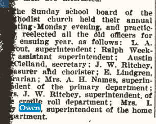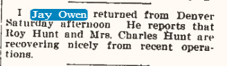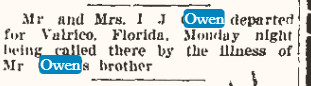 July 25, 1902 "Born - To Mr. and Mrs. I. Jay Owen, Wednesday morning at 4 o'clock, a big baby boy."
