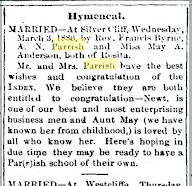A. N. Parish, 34 and Mary Anderson married on 3 Mar 1886 in Silver Cliff, Custer County, Colorado.