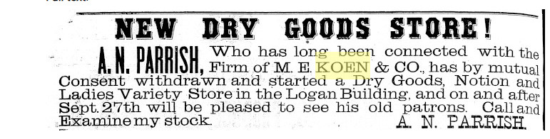 September 1885 Silver Cliff, Colorado "A. N. Parrish and Everet Koen came in from western Kansas Monday