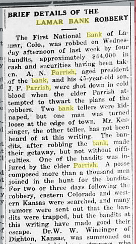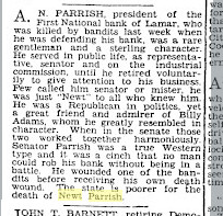 "President of the First National Bank at Lamar, CO. He and his son, bank teller John Parrish, were killed by four bank robbers on May 23, 1928."