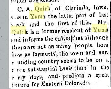 1902 "C. A. Quirk of Clarenda, Iowa, stopped off and chatted with Yuma people this week.