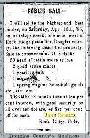 April 1886 "From parties in attendance we learn that the John Roberts sale on last Saturday was a success in every way. His stock, goods, etc,. sold readily and at good prices. Mr. R. will leave for Iowa in a few days where he proposes to make his home in the future. ."