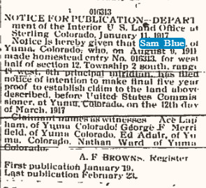 August 1919 "Mrs. Sam BLue and N. F. Ward, of south of Yuma, were called to Topeka, Kanss yesterday by a