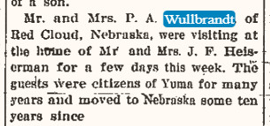 May 1911 "P. A. Wullbrandt, of Red Cloud, Nebr., anted for another year's subscription to the Pioneer this week."