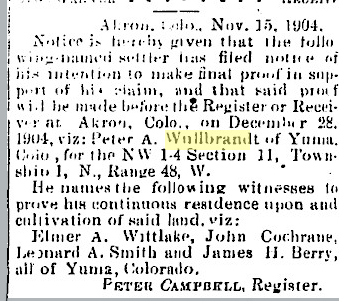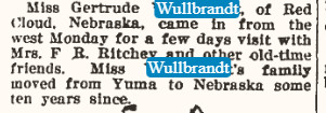 February 1907 Eckley "Mrs. Peter Wullbrandt of Yuma visited at the section house with Mrs. Eliott several days this week."