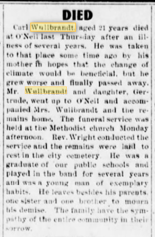 September 1907 "Mrs. Willbrandt is out from Nebraska on a visit with her son, P. A. Wullbrandt."