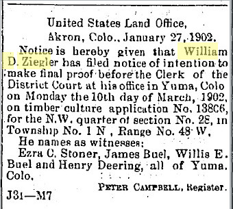 The Yuma County William Ziegler might be related to Marion C. Ziegler, who proved up a quarter in section 14, 4N 48W in 1893.