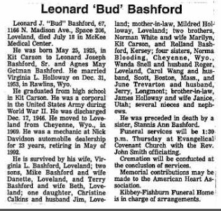 Another son Wayne Franklin Bashford born at Boulder April 3, 1935, died July 5, 1963.