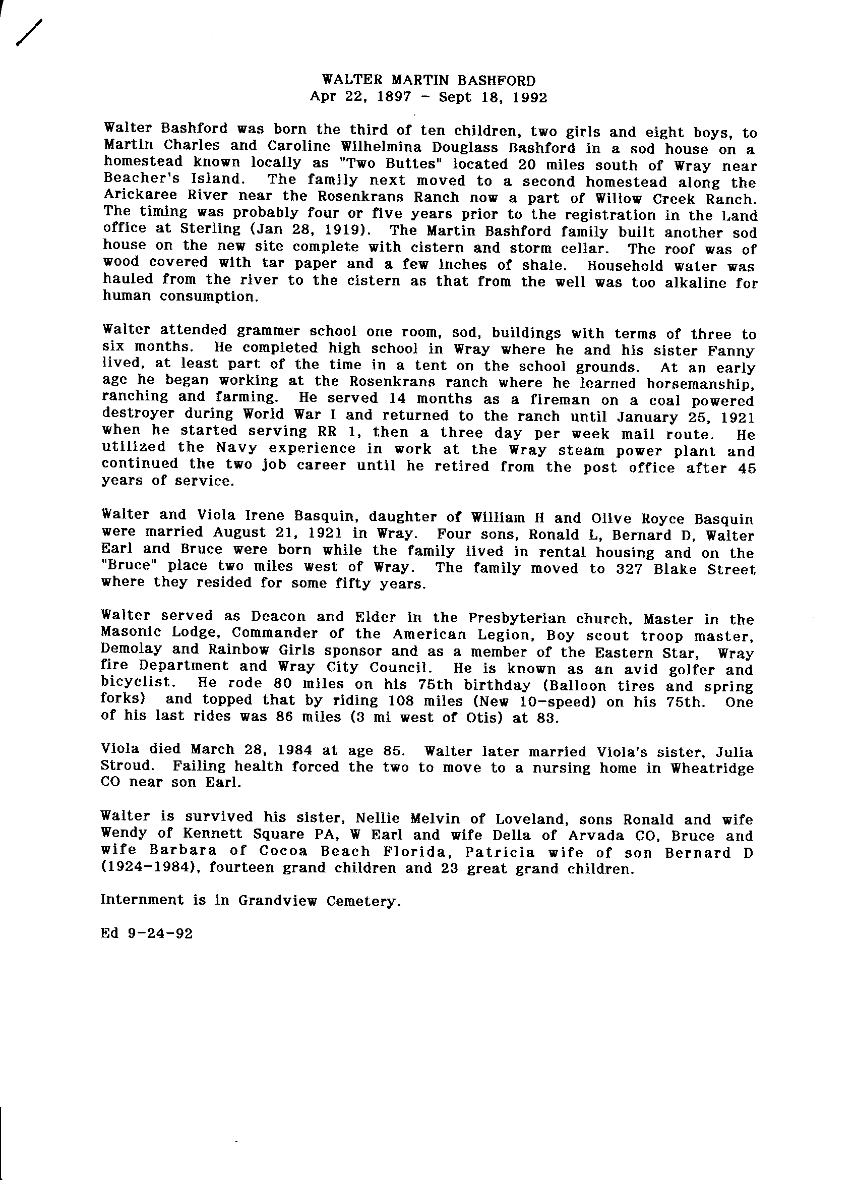 Walter Earl Bashford was born in Wray, Colorado on July 11, 1925 toViola Basquin Bashford, and Walter Martin Bashford. He was the third of 4 boys. His brothers were Ron, Bernie and Bruce. Earl and his family lived across from City Hall, which was built after they lived there. Earl was very active in his childhood. He played tennis and was on the swim team in high school. Earl was in college from 1943 ~ 1948 at CU Boulder. He studied Aeronautical Engineering and majored in engines. After 6 semesters of Engineering, he changed to Music. Earl graduated from Music school in 1948, and had enough hours in science and math to be able to teach those subjects also. In grade school, Earl's band teacher was Glenn Miller's older brother, Elmer. They called Elmer, "Doc". Earl and his 3 brothers played in the CU band. Ron played clarinet, Bernie played oboe, early played saxophone, Bruce played baritone. Earl also played with Herb Miller, Glenn's younger brother, in the circus band, and met Glenn Miller several times. Earl bought an old c-alto sax. He paid $35 for it. Earl bought an old e-flat alto sax when he was in college for $125 (Still played by his daughter, Lori, in the Jeffco Community Band).