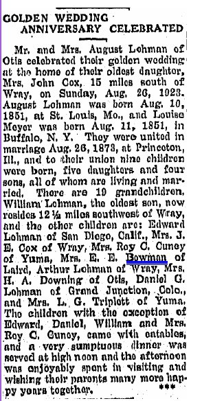 1913 Wray "Floyd Bowman, who came from his home in Illinois a short time ago and has been employed in work on the flats, was taken ill at the Ruff Roberts home but is reported to be far on the road to recovery" - probably a brother o Elbert.