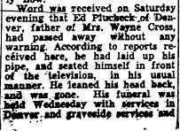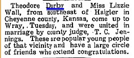 Theodore Darby of Haigler, Neb. was born July 3, 1884 in Poland which was a property of Russia, to Paul and Martha Darbin. He died at the age of 93 years, 10 months and one day April 4, 1956 at the Kinder Kare Home in Wauneta, Neb. Funeral services were held April 7 at Zion Lutheran Church in Haigler with Pastor Terry Douglass officiating. Theodore came to the United States with his parents at the age of three years, and lived in Pittsburgh, Pa. where his father worked in the coal mines. Later he moved to Hanna, Wyo., Denver and then with his family to Laird. At an early age he left home and went to live with Mr. and Mrs. Jim Douglass and this was his home until he took up a homestead in Cheyenne County Kansas in 1905.