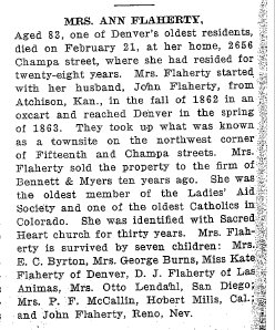 In 1900 Denver, Anne Flaherty born July 1830 in Ireland, immigrating in 1852, is widowed. One daughter Mary A. Murphy born March 1862 in Kansas is a sales lady, widowed, . Kate L. Flaherty born April 1864 in Colorado has no occupation, and Daniel April 1869 in Colorado is a steam fitter.