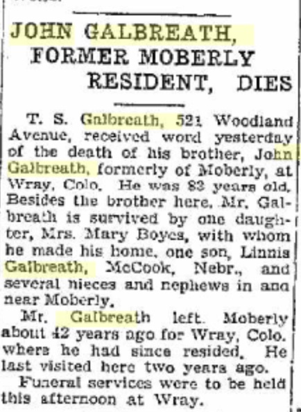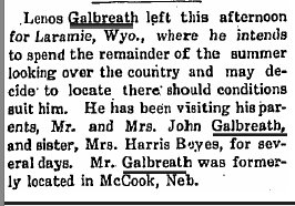 1913 "Lenos Galbreath, formerly of Wray but of McCook Nebraska for the past three years, came up yesterday and is visiting with his parents Mr. and Mrs. John Galbreath and his sister, Mrs. Harris Boyes of west of town."