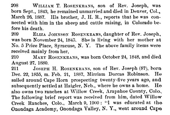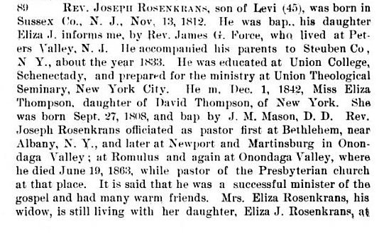 In 1860 Seneca County, New York, Joseph Rosenkrans is 47, born in New Jersey, a Presbyterian minister, with Eliza T. 41 born in New York. WIlliam T is 16 Eliza 14, Mary 11, and Joseph 4, all born in New York.