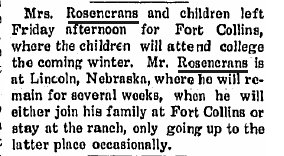 1910 Fort Collins "Mrs. F.D. Johnson and son, Frank, and daughter Laura, and William and Margaret Rosencrans, all of Wray, are guests this week of Mr. and Mrs. A.J. White. They are attending the short course."