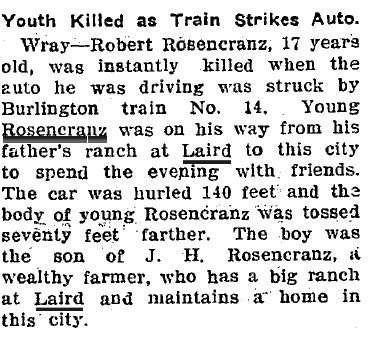 1910 "Irving Barker, of the Rosencrans ranch, was in Wray last week."