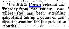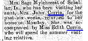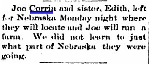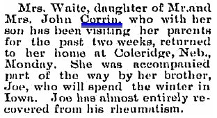 1901 Wray "W.C. Corrin's mother arrived from Essex,Ia., Thursday for a visit here."