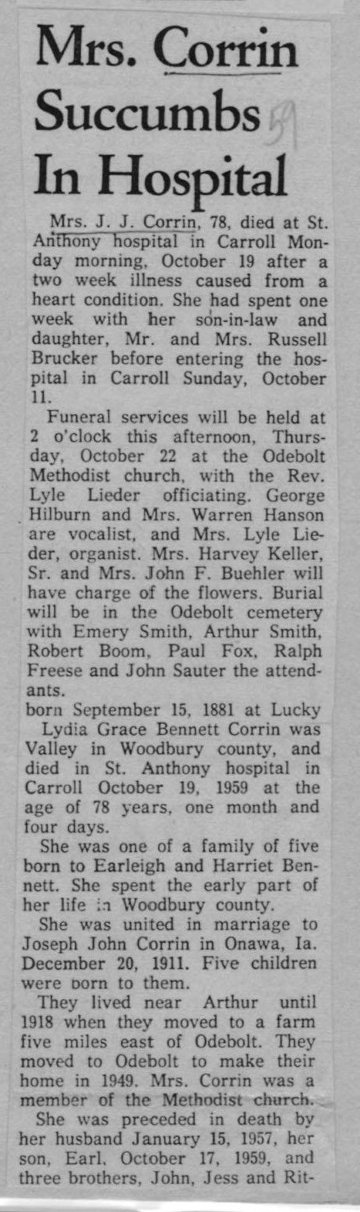 Grace's sister "The Anthon (Iowa) Herald, 8 March 1933, page 1: Iowa Dakota Bennett was born September 24, 1867, in the vicinity of Anthon in Woodbury Co., Iowa, and passed away in a hospital in Denver, Colorado, February 26, 1933, at the age of 66 years, 5 months and 2 days. In early life she was baptized and joined the Baptist church, to which faith she held to the end. She was united in marriage in 1883 to William Hoult, and to this union were born three sons and five daughters. Two sons and one daughter died in infancy. In 1910 she and her husband moved to Colorado, where she spent the remainder of her life. Those left to mourn her loss are her husband, William Hoult; one son John of Cherokee; four daughters, Mrs. Emily Dicus of Maybell, Colorado; Mrs. Anna Mullinex of Moville, Iowa; Mrs. Ruth Slaughter of Bethany, Missouri; and Mrs. Opal Warren of Akron, Colorado. She is also survived by four brothers, John, Jess and Ritner Bennett of Oto, Iowa; Edward Bennett of Montana; and two sisters, Mrs. Grace Corrin of Wall Lake, Iowa; and Mrs. Katie Fuller of California; 16 grandchildren and a host of friends. Mrs. Hoult's body was shipped to Anthon for burial, and funeral services were held in the Methodist church last Wednesday afternoon, the Rev. Watson Herrold officiating. Interment was in the Lucky Valley Cemetery."