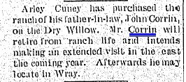 1901 Wray "Harve Cox has retired as head clerk at the Powell store, and Miss Edith Corrin has been promoted to the position."