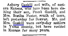 1908 "S.H. Gaskill and wife arrived in Wray Wednesday from Corning Iowa, and are visiting at the home of Mr. and Mrs. W.J. Weller. Mr. Gaskill is Mrs. Weller's brother."