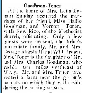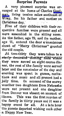 1911 "W.J. Goodman came in Tuesday evening to make a short visit with his brother, C.H. Goodman, of sixteen miles southesast of Wray."