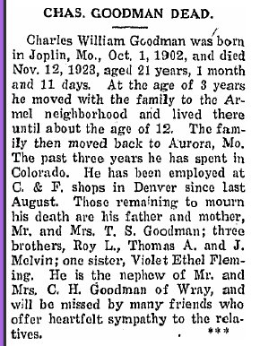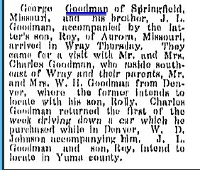 1919 "G.W. Goodman of Springfield, Mo. is visiting his brother C.H. Goodman, south of Wray, this week. He is going to Denver and other points before returning home."