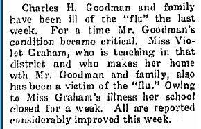 1919 "Charles H. Goodman and brother, George, left Thursday morning for Denver to visit their sister, Mrs. Lila Egan. Charles will remain in the Capital city a few weeks to rest up before resuming spring work on his farm."