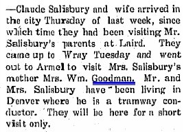1909 Laird "Mrs. C.W. Salisbury came down from Denver Thursday to be at the bedside of her mother, Mrs. John Goodman, who is not expected to live."