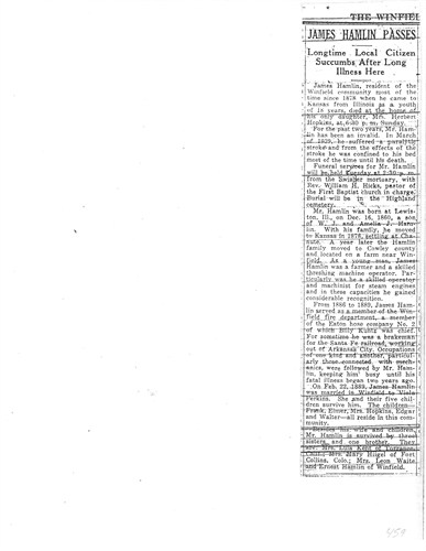 1904 "Frank Hamlin, the oldest son of Mr. and Mrs. James Hamlin, is sick with pneumonia fever."